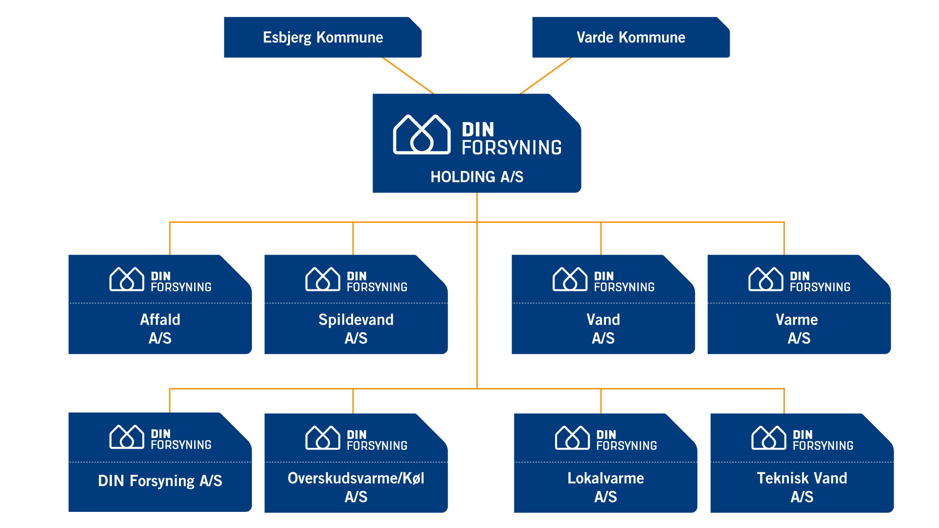 DIN Forsyning består af en række selskaber, som du kan se nedenfor. DIN Forsyning A/S er navnet på det fælles serviceselskab, der undersøtter selskaberne i Esbjerg og Varde forsyningskoncerner. De enkelte selskaber har alle individuelle CVR- og EAN-numre.